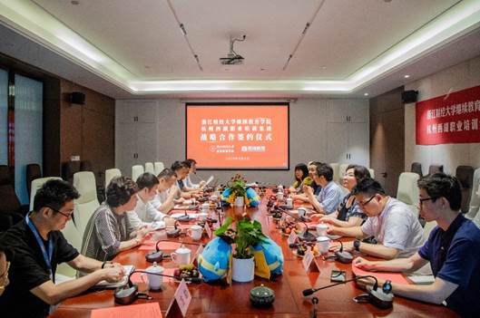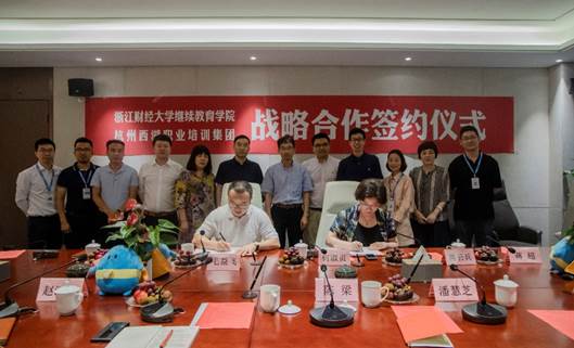 6月3日,我院与杭州西湖职业培训集团战略合作协议签约仪式在杭州萧山智慧谷举行。副校长李永友,学院院长何淑贞、党总支书记王聪、副院长蒋云兵,西培集团董事长毛益飞、副总裁赵江海、陈梁等出席签约仪式。