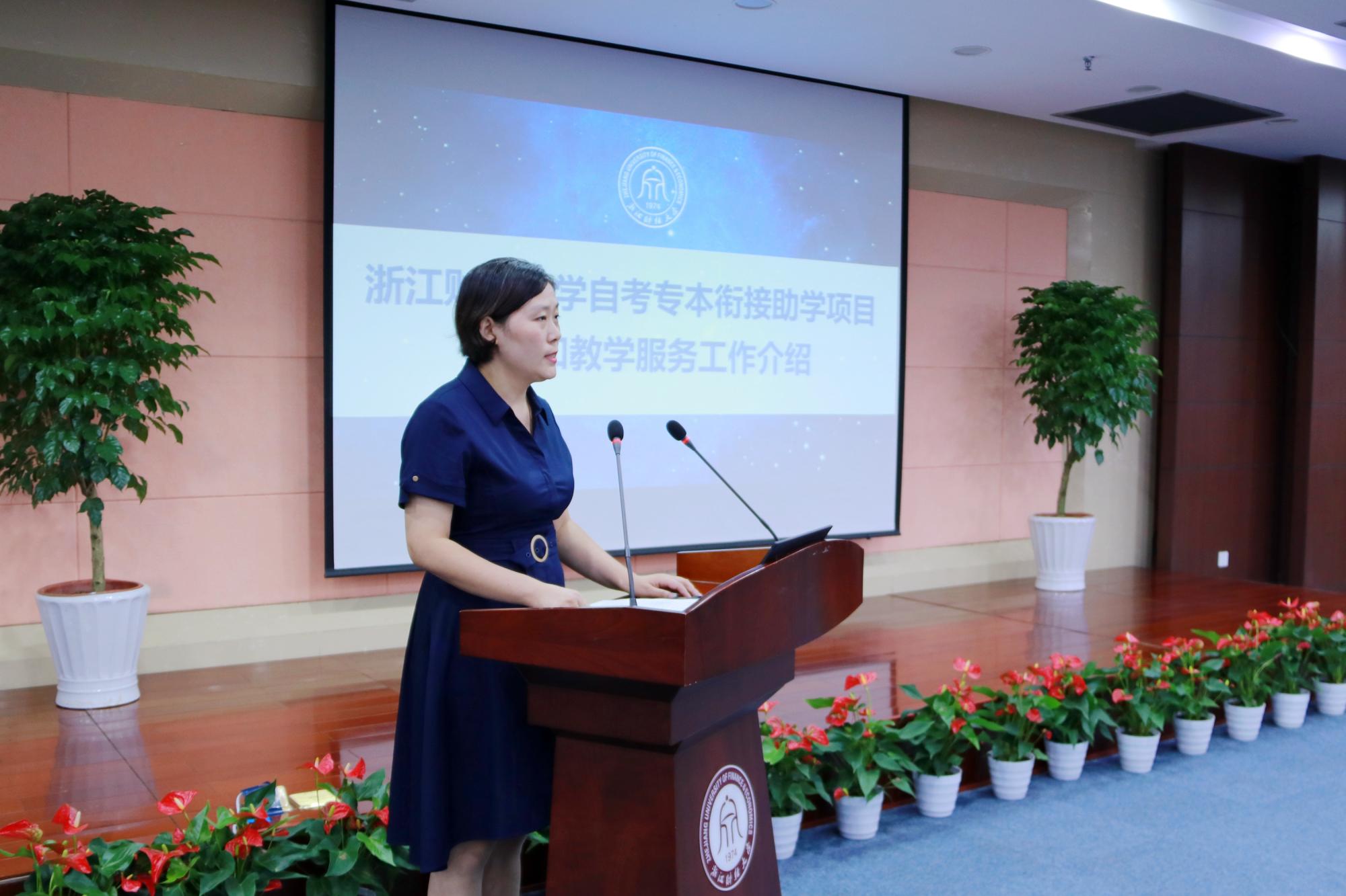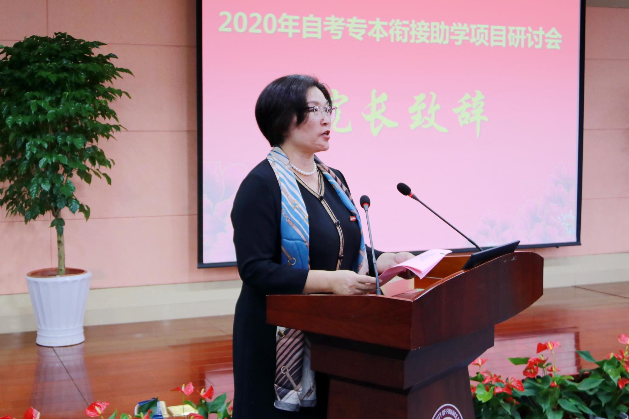 何淑贞院长致欢迎辞,她代表学校对大力支持我校自考工作的与会院校表示衷心感谢,并简要介绍了学校发展概况和继续教育工作基本情况。她指出,举行此次会议是为了进一步履行好学校自考本科专业主考院校职责,加强本科院校与专科院校的对接交流和办学合作,实现资源共享和优势互补,从而为高职院校学生提供更多更广的学历提升渠道。她希望通过此次会议,双方进一步增进感情、扩大共识,共享办学经验,共谋自考发展,共商合作事宜,努力为浙江省自考事业发展作出更大更新的贡献。