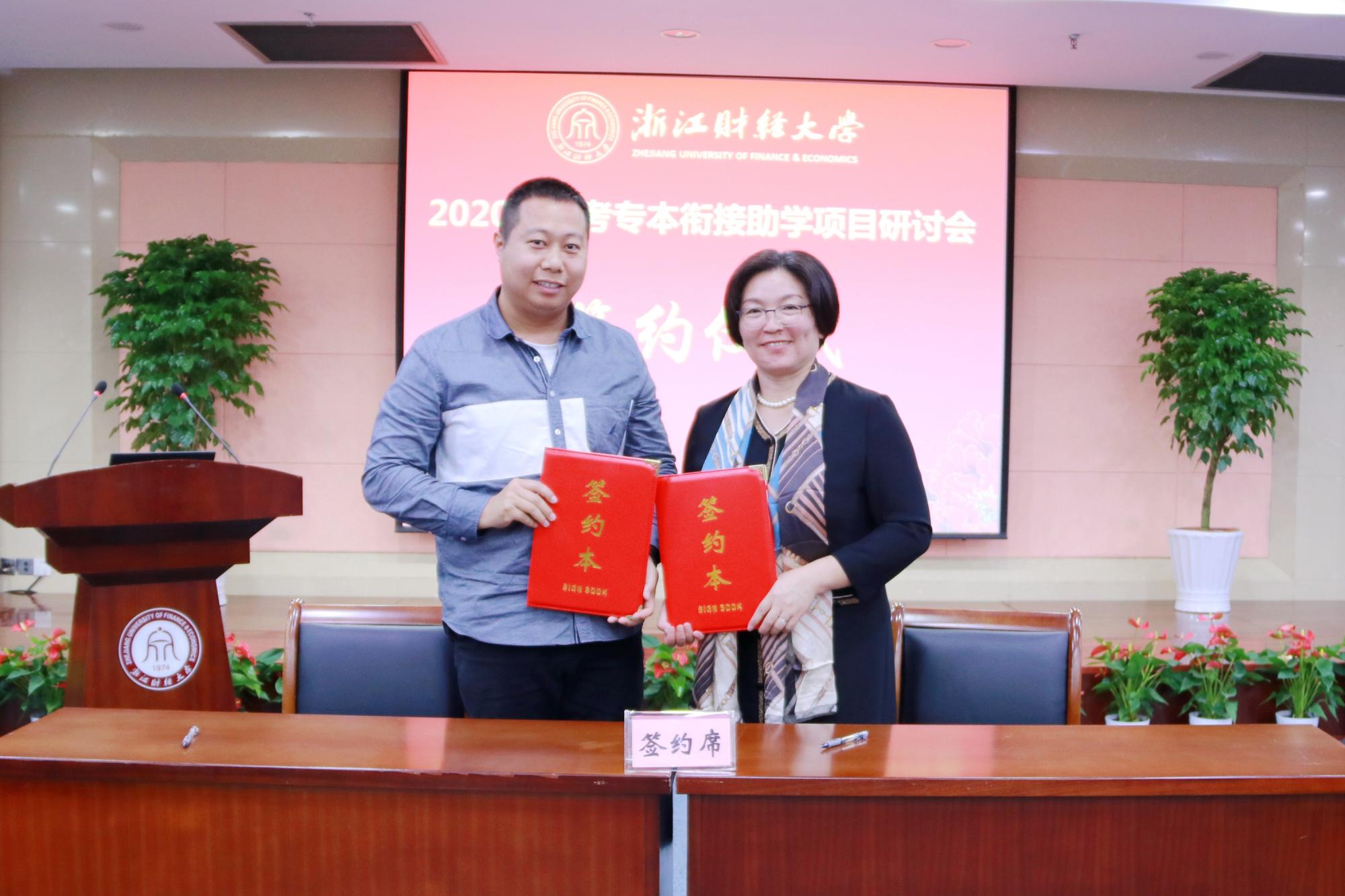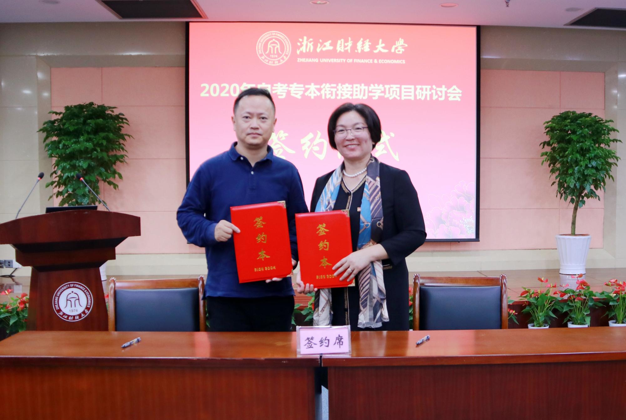 会上进行了项目签约仪式,何淑贞院长与浙江金融职业学院、浙江汽车职业技术学院代表,分别签订了学校自考专本衔接助学项目办学合作协议。