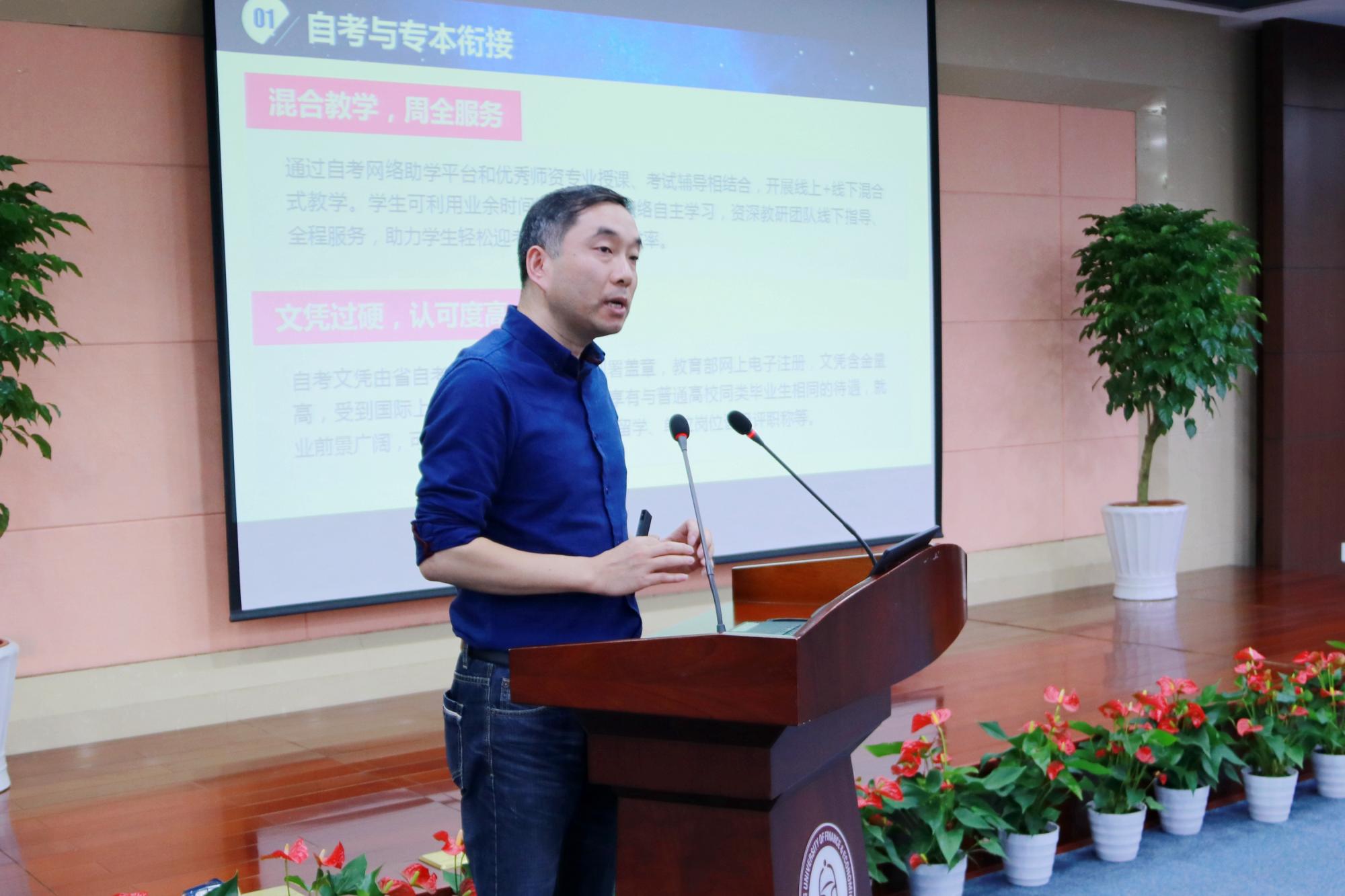 王聪书记对学校自考专本衔接助学项目相关情况进行了介绍。他分析了自学考试概念政策和自考专本衔接特点,围绕专业计划、开课安排、课程优化、考试形式、收费标准等方面对学校自考专本衔接项目作了详细说明,阐明了学校品牌好、专业美誉高、助学渠道多、政策力度大等项目办学优势,并热诚欢迎各高职院校与我校开展自考专本衔接助学项目的办学合作。